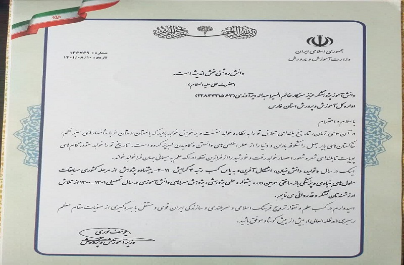 سرکار خانم المیرا عبداله دیز آوندی کسب مقام برتر کشوری در مسابقات سلول های بنیادی پزشکی بازساختی را خدمت شما و خانواده محترمتان تبریک عرض می نمائیم . با آرزوی موفقیت دبیرستان نجمه